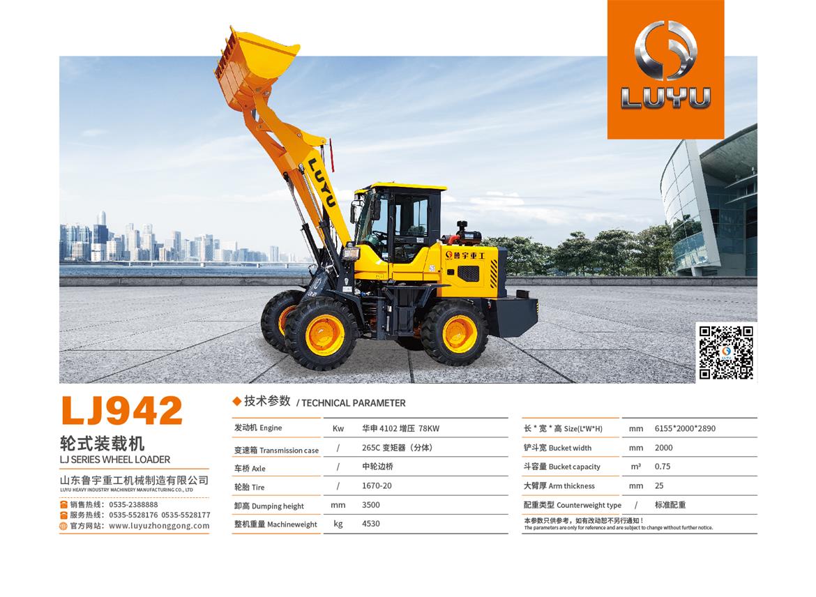 Lu Yu heavy loader series of products, are the best choice of the domestic and international best quality ?accessories, reliable quality, in line with the needs of human nature unique fuel nozzle guide set, oiling is simple, easy to centralized grease ?Fine pipe design, rationalization of the pipeline layout, beautiful and practical, easy to check and repair ?Bucket, automatic flat, reduce the fatigue of the driver, single pump shunt, with priority sensing steering system, energy saving ?Single lever control, reduce driving fatigue and improve work efficiency, four wheel clamp disc brake safety and reliability ?Design, small turning radius, load sensing coaxial flow amplification, light, flexible and efficient. ?Ideal operating speed and a 40 degree shift angle significantly improve work efficiency ?International standard noise reduction technology, to protect the driver's physical and mental health, to ensure that the work efficiency ?Industry leading cooling system to ensure continuous operation at high temperature.