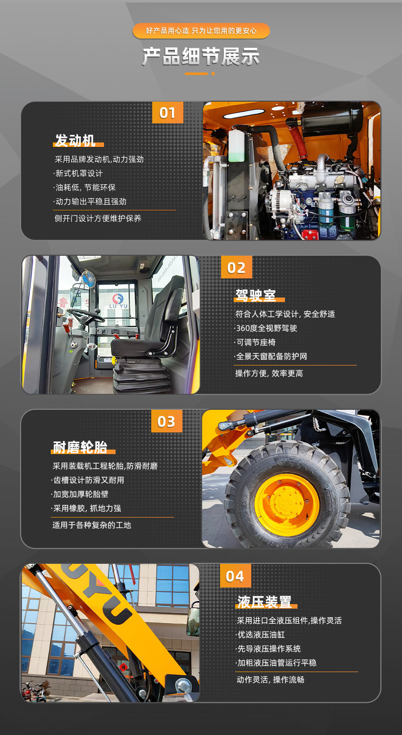 魯宇重工裝載機(jī)系列產(chǎn)品,均選配優(yōu)良的配件,符合人性化需求:加油嘴外引設(shè)置,注油簡(jiǎn)便,易于集中加注黃油; 精細(xì)化管路設(shè)計(jì),合理化管路布局,美觀實(shí)用、易檢易修; 鏟斗自動(dòng)放平,減輕駕駛員疲勞強(qiáng)度,單泵分流,優(yōu)先符合傳感轉(zhuǎn)向系統(tǒng),經(jīng)濟(jì)節(jié)能; 單桿操縱,減輕駕駛疲勞提高工作效率,四輪鉗盤式制動(dòng)可靠; 對(duì)中設(shè)計(jì),轉(zhuǎn)彎半徑??;負(fù)荷傳感同軸流量放大轉(zhuǎn)向,輕便、靈活; 理想作業(yè)速度與40度轉(zhuǎn)向角度大幅提升工作效率;國(guó)際標(biāo)準(zhǔn)降噪技術(shù),保護(hù)駕駛員身心健康,業(yè)內(nèi)好口碑散熱系統(tǒng)。